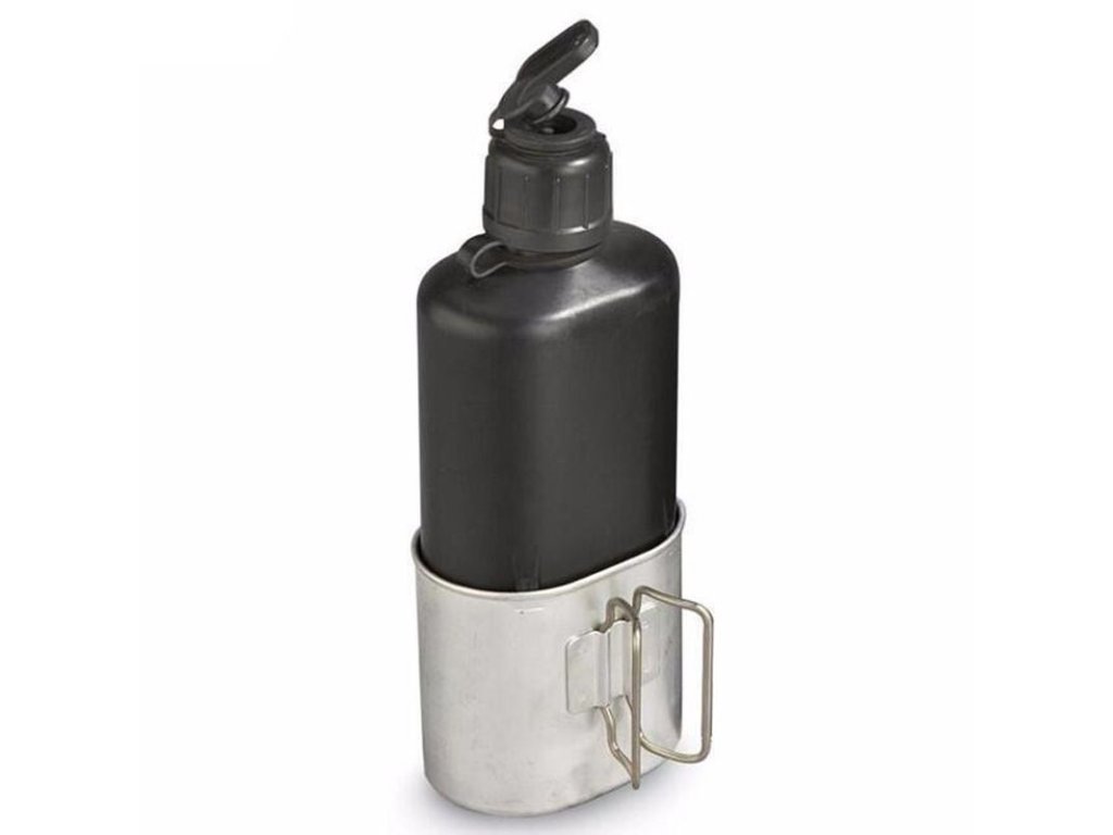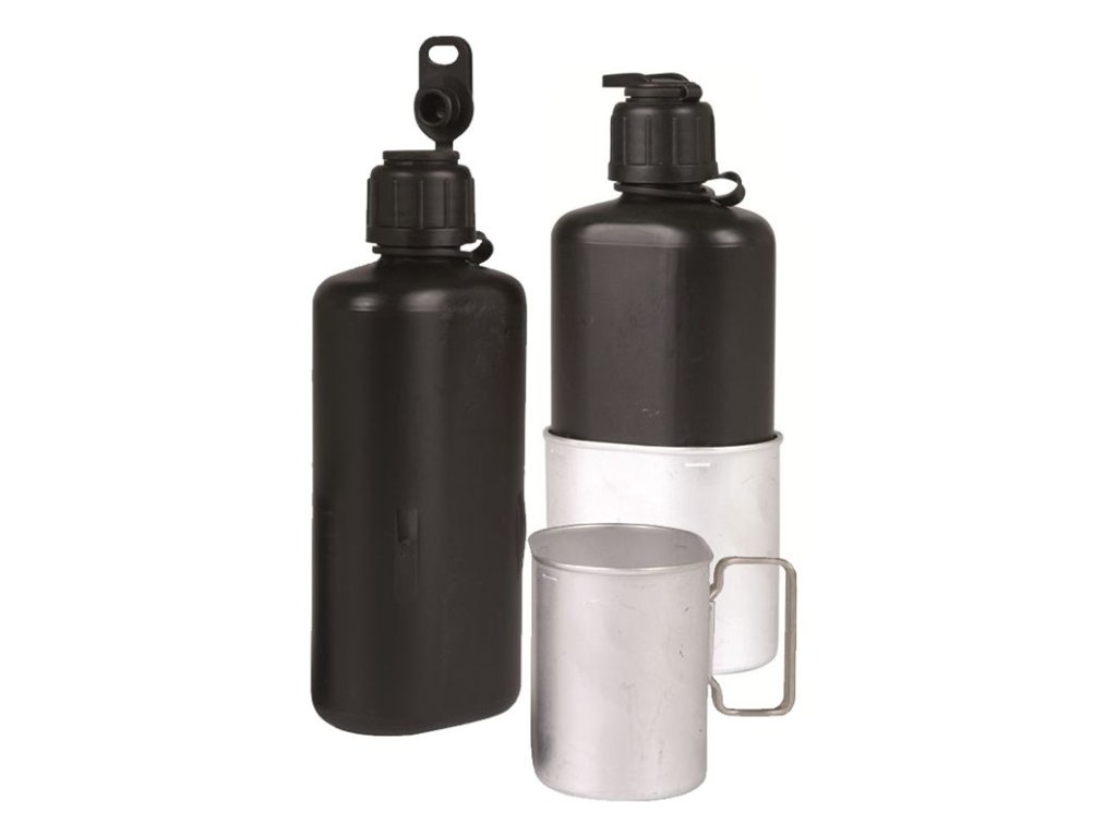 Originální polní komplet na pití, model 84, používaný Švýcarskou armádouPolní láhev je vyrobená z hygienicky nezávadného plastu černé barvy. Je opatřená šroubovatelným uzávěrem s hydratačním systémem a hliníkovým pitítkem. Polní láhev je oproti klasickým polním láhvím tenká a podlouhlá, avšak o obsahu cca 0,7L. Pro svůj tvar je obvzláště vhodná pro přenášení v bočních kapsách batožiny.