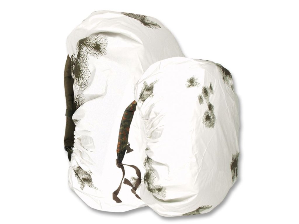 Nepromokavý obal na batoh v zimní kamufláži, v nabídce ve dvou velikostních provedeníchObal je z vyroben Rip-Stop látky ( látka protkaná dvojitým vláknem v pravidelných intervalech, tím se získají malé čtverce, které zabraňují trhlinám dále se rozšiřovat ), zevnitř kombinovaně pogumovaný, v zimním maskovacím provedení. Po celém obvodu je stahovací guma, která zajištuje upevnění na batohu, vše je navíc pojištěno dalšími přídavnými tkanicemi.