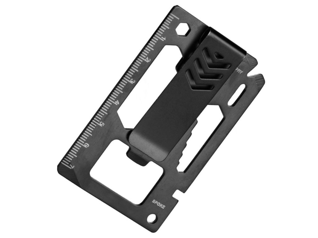 Praktická, kovová nářaďová pomůcka velikosti běžné kreditní karty, s mnoho funkcemi- Plochá, lehká a multifunkční karta