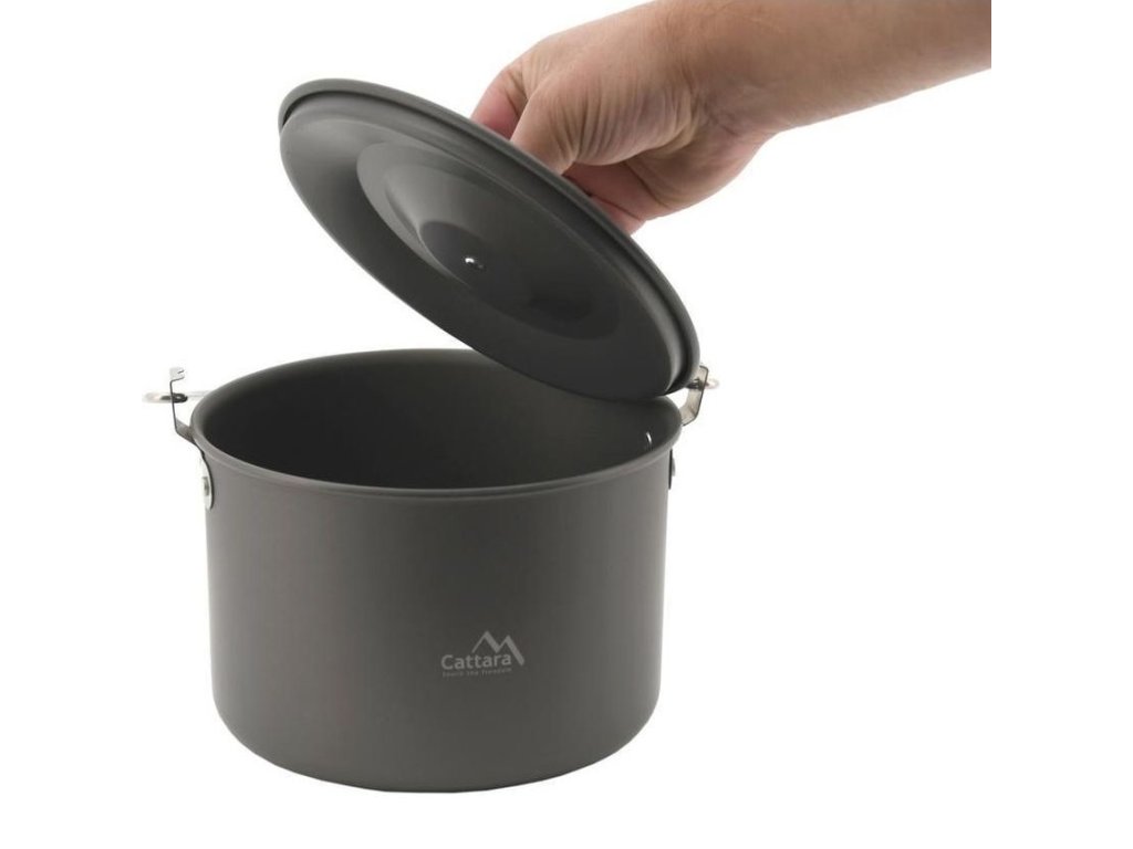 Ooutdoorový robustní 4–5 l kotlík z tmavě šedého anodizovaného hliníku. Průměr 21cm, výška 14cm a gramáž pouhých 540g, ideální společník pro vaření v příroděKotlík Cattara FIELD 13629 – robustní 4–5 l outdoorový kotlík z tmavě šedého anodizovaného hliníku. S průměrem 21 cm, výškou 14 cm a gramáží pouhých 540 g je ideální pro trampské a kempingové vaření. Praktické sklopné ucho umožňuje pohodlné zavěšení nad oheň nebo varič. Víko s držátkem usnadňuje manipulaci, a díky síťovému obalu je uložení a přenos hračkou. Dopřejte si kvalitní a odolný outdoorový nástroj.