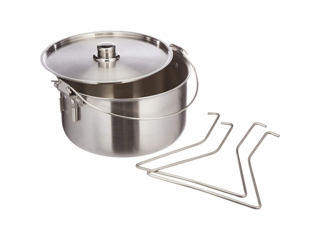 Nerezový kempingový 10-litrový kotlíkový hrnec s dvojitým držadlem, pokličkou a praktickými nožičkami s universálním využitímNerezový kotlík / hrnec Origin Outdoors nabízí dostatečný objem pro táboření, bivakování nebo zahradní párty.