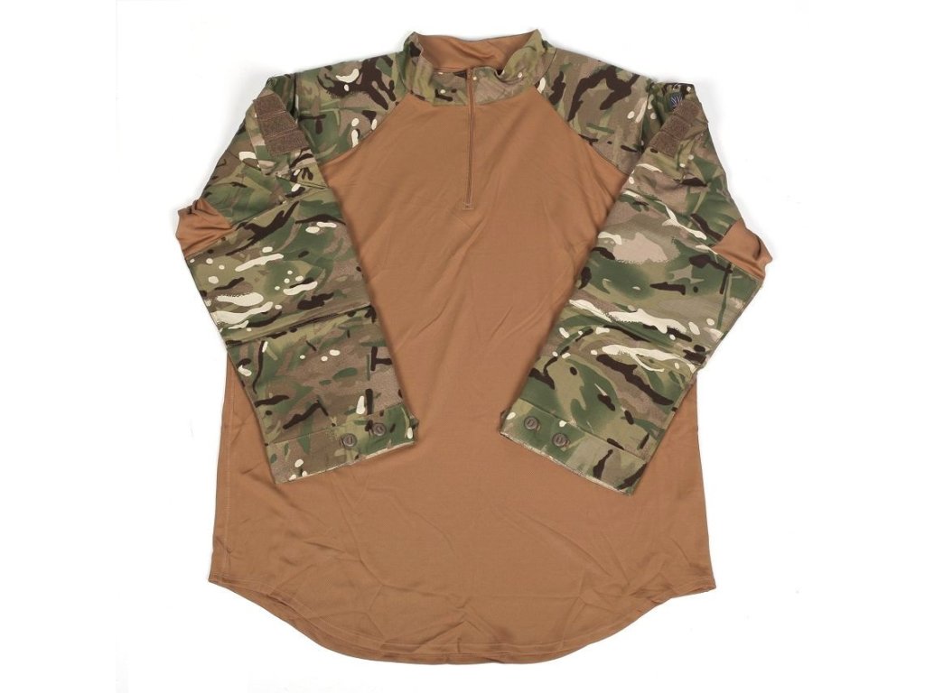 Under Body Armour Combat Shirt - bojová košile s vycpávkami pod ochrannou vestu HOT WEATHER, Britská armáda v maskování MTP ( Multi-Terrain Pattern )Taktická košile ( neboli také taktické triko ) určeno k nošení pod bojovou vestu. Zatímco rukávy poskytují stejné užitné vlastnosti jako běžná maskovací uniforma, jen doplněné o komfortní a snadno přístupné kapsy na ramenech, trupová část usnadňuje termoregulaci těla ( funkční a prodyšný materiál Coolmax ), saje a odvádí pot od těla a neumožňuje vytvoření mikroklimatu mezi tělem nositele a oděvem. Košile je velmi tenká, pod balistickou vestou vás nijak neomezuje a netlačí.