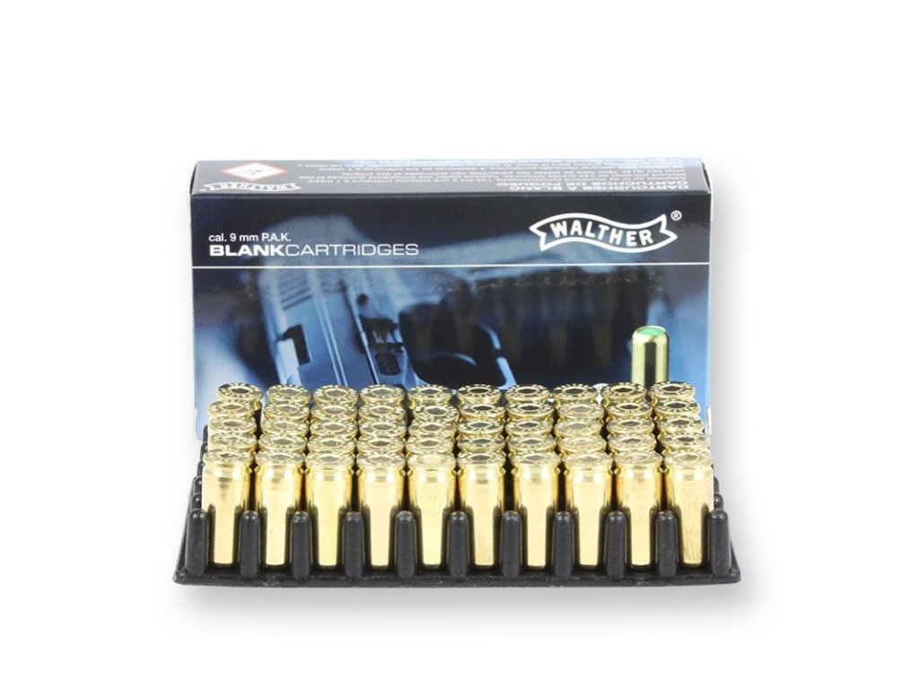 Akustické startovací, slepé, nesmrtící, poplašné náboje cal. 9mm P.A.K.Walther Blank Cartridges 9 mm P.A.K. - startovací, slepé, nesmrtící náboje, doporučené střelivo do plynových zbraní. Baleno po 50ks/krabička, uvedená cena za 1ks, volný prodej na kusy.