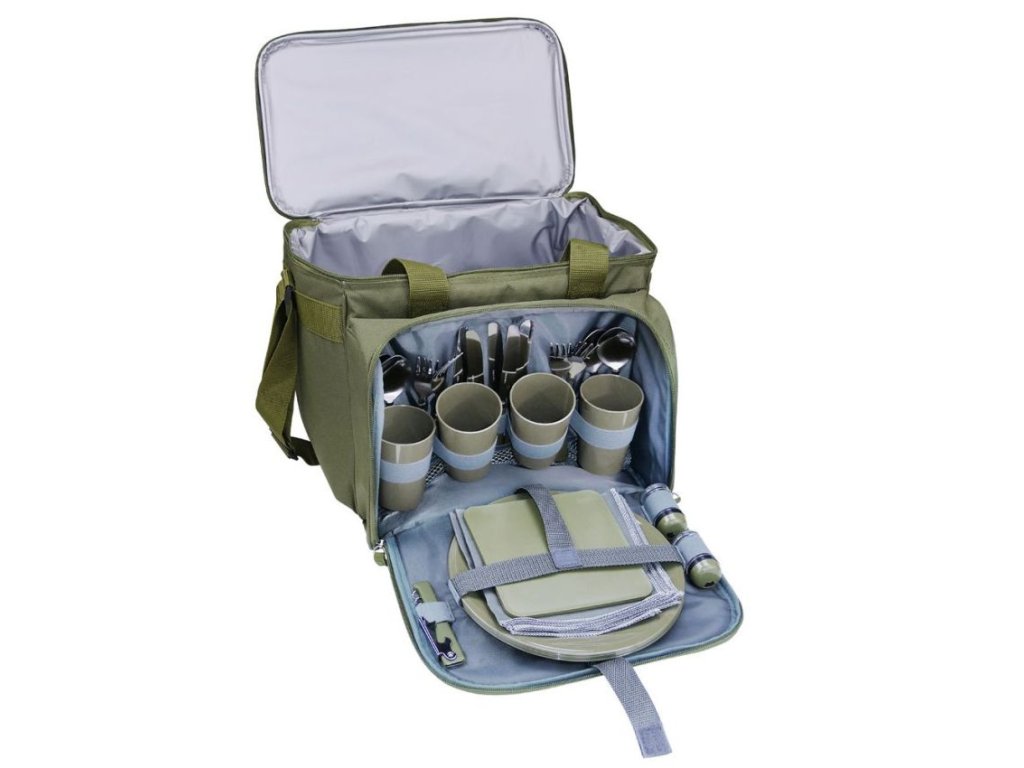 Pikniková TERMO taška s popruhem přes rameno, set nádobí pro čtyři osoby- Pikniková zelená outdoor taška přes rameno se setem nádobí pro čtyři osoby