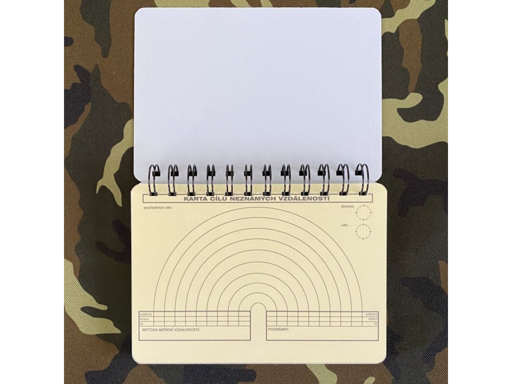 Profesionální denník pro odstřelovače, příručka 108stran, balistické tabulky, pozorovací karta cílů, se zápisem na smazatelnou folii, vyhodnocení studené rányKaždý odstřelovač si vede svůj střelecký deník, který obsahuje údaje o zbrani, střelivu, typech terčů a jejich rozměrech, seřizování mířidel a tabulky určování vzdálenosti a střelby za větru. Je to cenný zdroj informací získaný při vojenských cvičeních a na ostré akci usnadní práci odstřelovače.