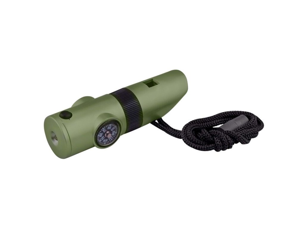 Kvalitní plastová dvoutónová píšťalka se sedmi funkcemi jako je kompas, svítilna, teploměr....Vyrobeno ze 100% plastu vojenské olivové barvy. Kompaktní rozměry cca 10x3cm.