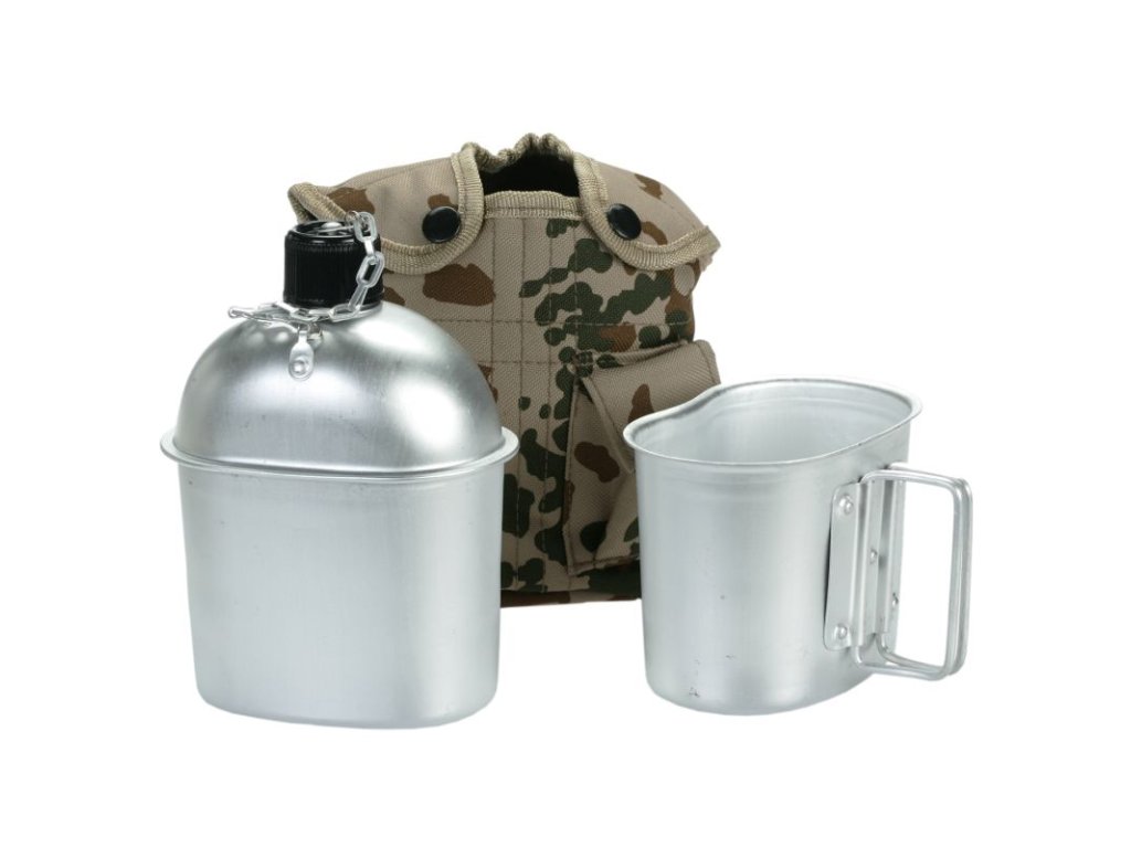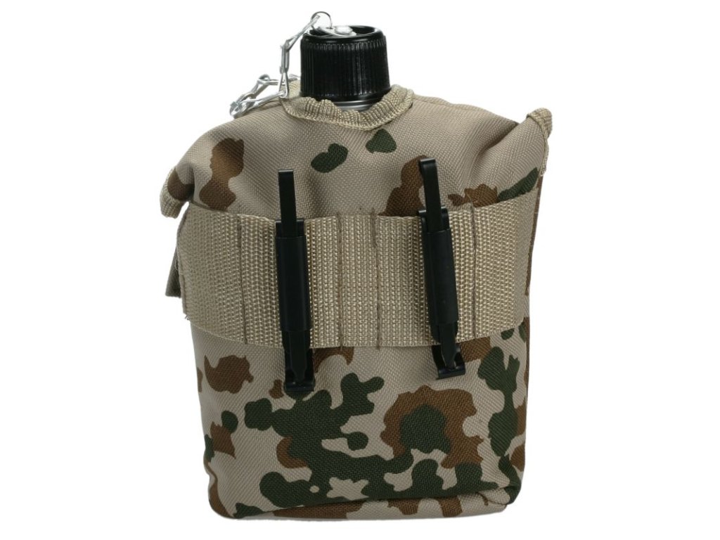 Hliníková polní láhev s pitítkem a obalem v maskovacím vzoru Punktarn Tropik používaném v Německém BundeswehruPolní láhev má šroubovatelný uzávěr a nylonové pouzdro odolné proti oděru ( 100% Polyester ). Vnitřek pouzdra je podšitý vláknem imitujícím kožešinu, která služí k udržení nápoje v původní teplotě! Uchycení na opasek dvěma alice klipy ( jsou součástí dodávky ). Součástí je také praktické pitítko, které lze vsadit do pouzdra. Obsah cca 1l. Láhev je nová - nepoužitá. ,