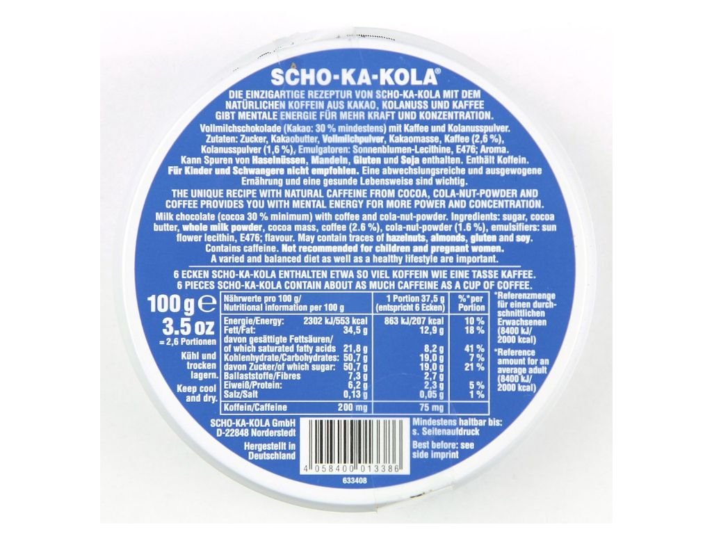 Energetická čokoláda Scho-ka-kola mléčná s obsahem 30% kakaa, používaná pro armádní účely již od roku 1935Pro každého, kdo preferuje sladkou chuť mléčné čokolády, ale nemíní se vzdát své dávky koncentrované energie, je tady Scho-ka-kola Vollmilch. Sladší verze původní receptury z roku 1935 zaručuje stejnou dávku energie, na kterou jste u Scho-ka-koly zvyklí, avšak s jemnou mléčnou chutí čokolády s 30% kakaa.