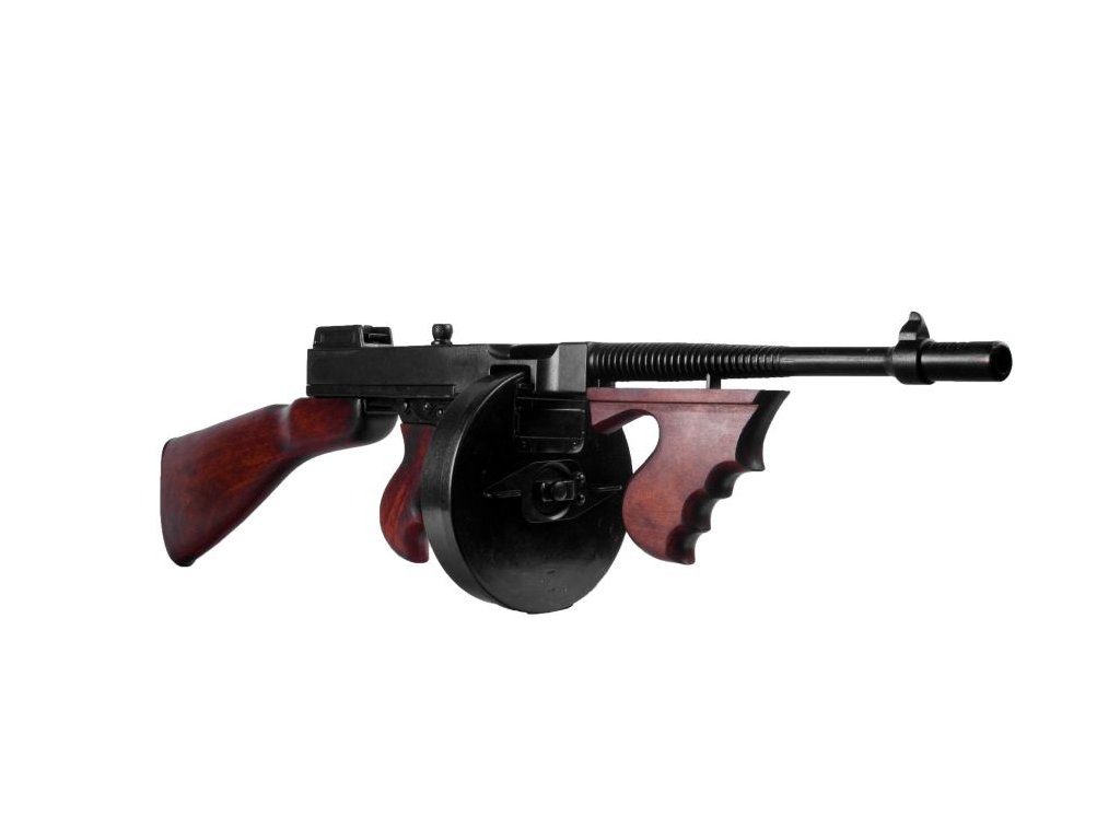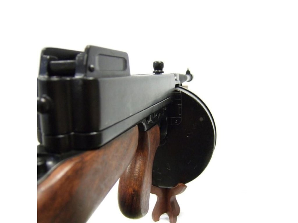 Dekorační replika amerického "gangsterského" samopalu Thompson M1 s bubnovým zásobníkem, používaného za 2.světové válkyDokonalá, střelby neschopná replika amerického samopalu Thompson M1 s bubnovým padesátiranným zásobníkem. Samopal především známý v době prohibice v USA, kdy byl rozšířený jak v řadách americké policie, tak v podsvětí. Thompson byl znám také jako Tommy Gun nebo Chopper. Zbraň byla oblíbená především pro svou kompaktnost, účinné střelivo a velkou spolehlivost. Samopal Thompson byl široce používán v americké armádě a rovněž tvořil výzbroj spojeneckých vojsk v období druhé světové války. Používal se až do závěru vietnamské války.