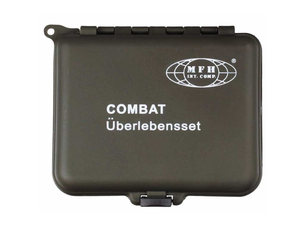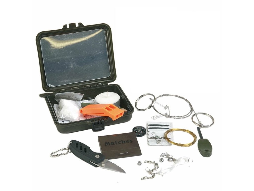 nožík, píšťalka, strunová pilka, drátek, vata, sirky, svíčka, tužka, minikompas, šitíčko ( 3 barvy nití, jehla, knoflíky ), magneziový podpalovač, spínací špendlíky, sada háčků na ryby, zrcátko atd...
