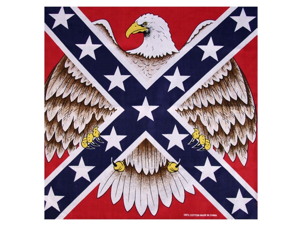 Vázací čtevercový šátek s motivem Jižanské vlajky s OrlemKvalitní šátek ze 100% bavlny. Má čtvercový tvar o rozměru 55x55cm a potisk umožňuje složení do trojúhelníku nebo čelenky. Lze jej také nouzově využít při první pomoci např. k ošetření zlomenin, podobně jako klasický zdravotnický trojcípý šátek.