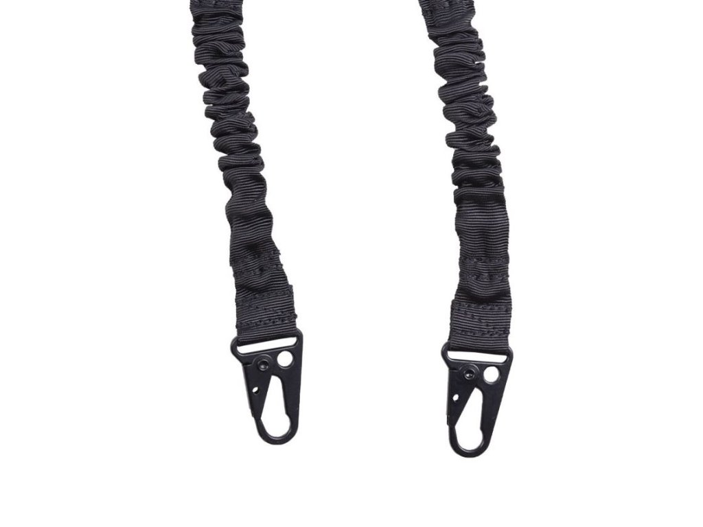 Dvoubodový délkově nastavitelný taktický popruh na zbraň částečně elastický, upevěnění pomocí dvou kovových karabin- Dva montážní body s karabinami